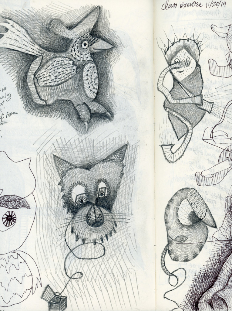 Sometimes we’ll draw at drawing “stations” where we choose from a menu of exercise options, staying for as little or as long as we want to at a station. These sorts of exercises will focus on stretching, distorting, or abstracting images that we’ll draw using exaggeration in an imaginative drawingfrom observation. On a different station-day we’ll explore the use of “randomness” as the basis for making something new: random squiggles on a page, random cracks in the sidewalk, or random shapes of clouds can provide the building blocks for making faces, creatures, or monsters. Each week we learn something new about the creative process. Along the way we’ll ask the question, Where do creative ideas come from? We’ll engage exercises that seem to get to the heart of creativity, bringing disparate ideas together in ways that are new. We’ll also learn about how to keep a sketchbook-journal, using artist Corita Kent’s focus on the journal as a “sense diary,” and cartoonist Lynda Barry’s “daily diary” formats to bring words and images together. Towards the end of the eight-week session, we’ll discuss composition, that is, how to arrange the elements in our drawings with attention to the drawing as a whole. We’ll then imagine a drawing that we would like to make, plan it, and make it.