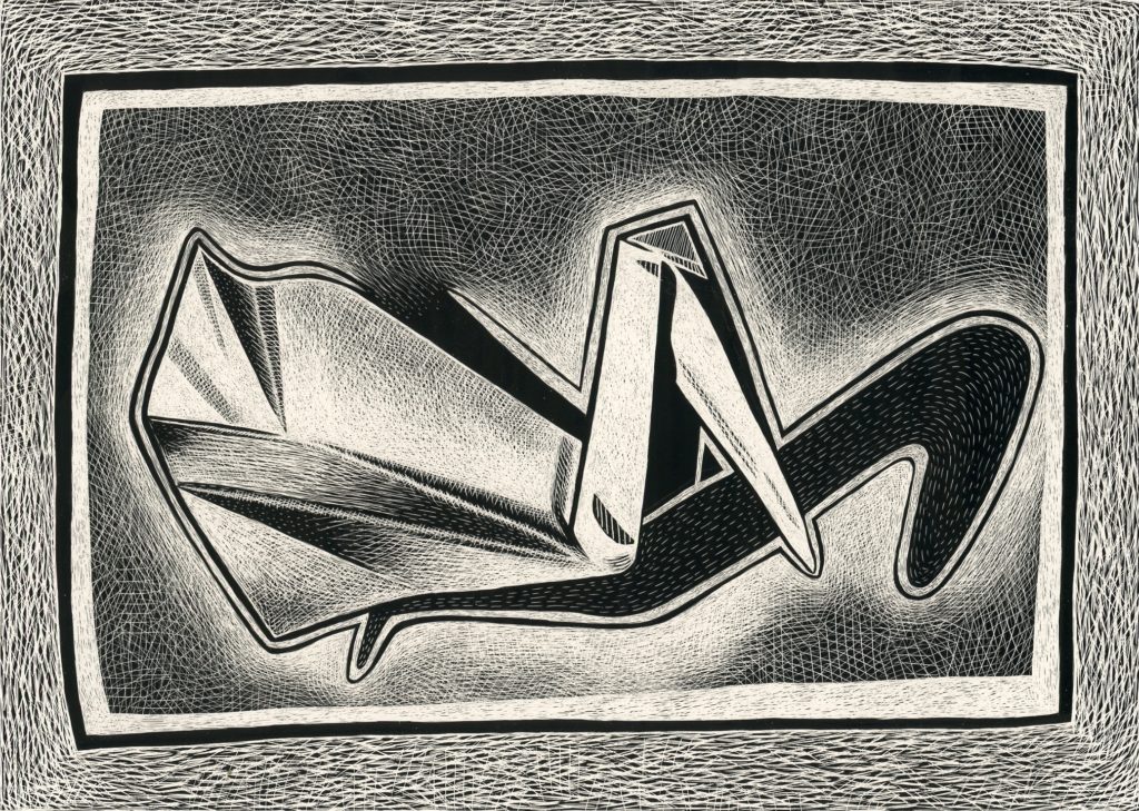 While walking at the Baker Wetlands a few weeks ago, I was thrilled to see a line of more than 50 pelicans making their way across the sky, single file. I’m always amazed when I see pelicans in Kansas, their presence feels so improbable here. I had been making sketchbook-drawings of origami cranes as a kind of meditation during this crazy time. But with pelicans on my mind, I thought it would be fun to fold and draw an origami pelican, too. I made a drawing of the pelican in ballpoint pen first, and then made it again in scratchboard.